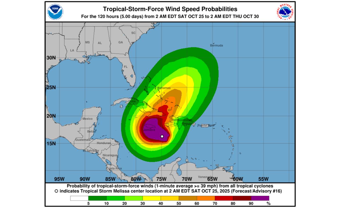 La tormenta tropical Melissa, ubicada a distancia sobre el Caribe central, mantiene un flujo húmedo sobre la región, con valores de humedad precipitable sobre 2 pulgadas, lo que sostiene un patrón lluvioso que se prolongará hasta el domingo. El riesgo de inundaciones seguirá elevado a significativo durante este periodo.