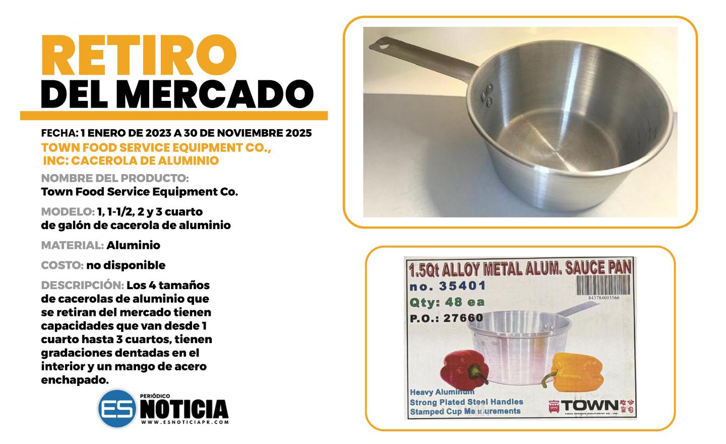«Estoy emitiendo una alerta a la comunidad sobre el retiro del mercado de varias cacerolas de aluminio de la marca Town Food Service Equipment Co. El mismo responde a una notificación relacionada con productos distribuidos y vendidos entre el 1 de enero de 2023 y el 30 de noviembre de 2025, los cuales pudieron haber sido importados o adquiridos en Puerto Rico desde Estados Unidos u otros países», indicó.