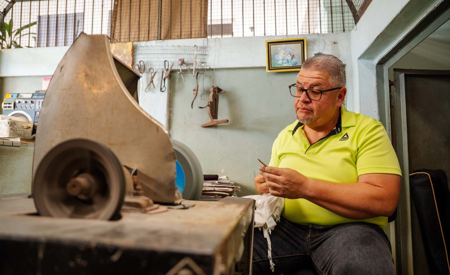 Antonio tiene como instrumento de trabajo una piedra de esmeril que comprar en los Estados Unidos y que tiene conectada a un motor rústico que mantiene una revolución constante para dar uniformidad al filo.