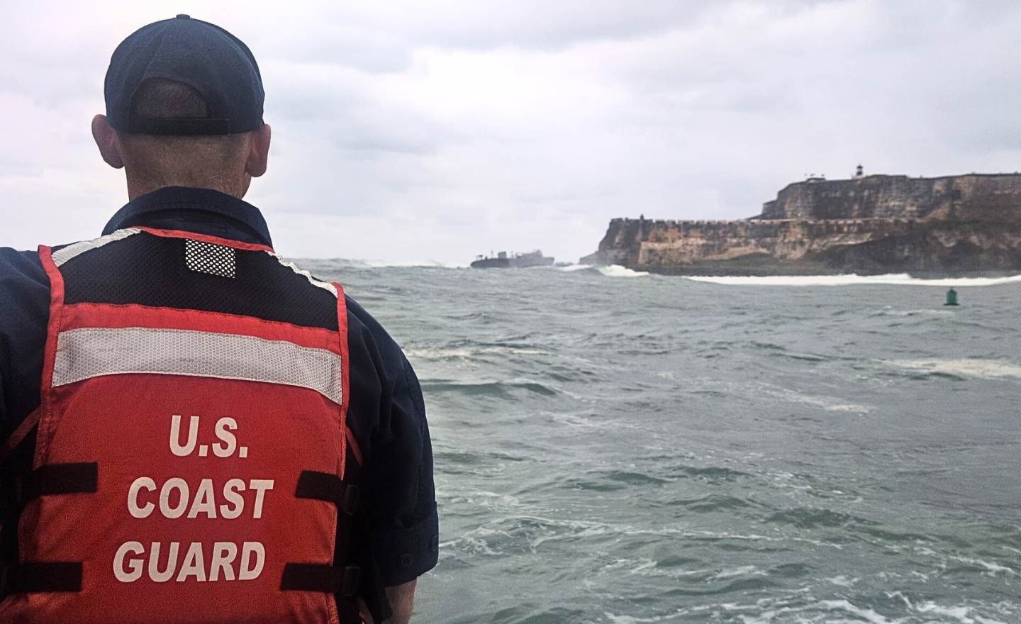 Personal de la Guardia Costera del Sector San Juan atienden, junto a los organismos locales de respuesta a emergencias, la situación con una barcaza de combustible que encalló -esta tarde- en la entrada del puerto de San Juan, en las inmediaciones del Castillo de San Felipe del Morro.