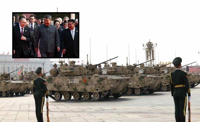 Xi inspeccionó a las tropas desde un auto descapotable que recorrió la avenida Chang’an, antes de reunirse con sus invitados bajo el emblemático retrato de Mao Zedong en la entrada a la Ciudad Prohibida.