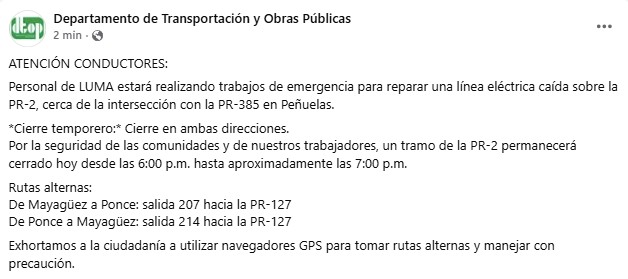 La empresa LUMA Energy informó que la carretera PR-2, en jurisdicción de Peñuelas, será cerrada al tránsito debido a un poste que cayó en la vía e interrumpe el tráfico.