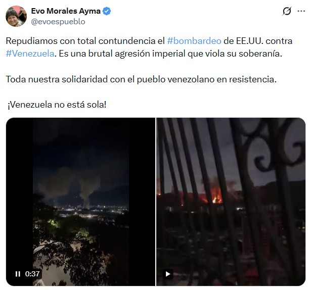 Por su parte, Evo Morales, el expresidente de Bolivia, escribió en las redes sociales su repudio a la agresión. «Repudiamos con total contundencia el #bombardeo de EE.UU. contra #Venezuela. Es una brutal agresión imperial que viola su soberanía. Toda nuestra solidaridad con el pueblo venezolano en resistencia. ¡Venezuela no está sola!».