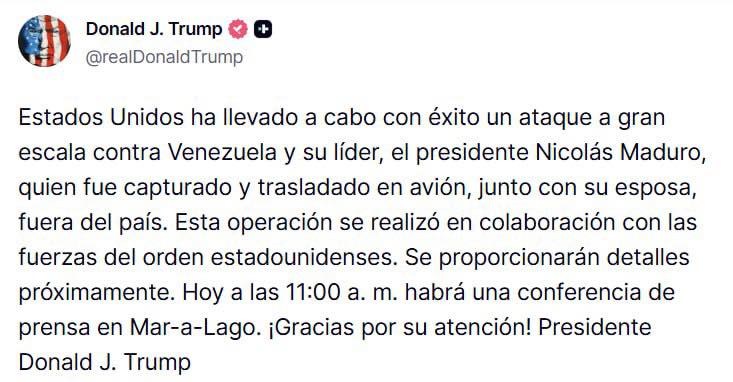 «Estados Unidos ha llevado a cabo con éxito un ataque a gran escala contra Venezuela y su líder, el presidente Nicolás Maduro, quien fue capturado y trasladado en avión, junto con su esposa, fuera del país», escribió Trump en las redes sociales.