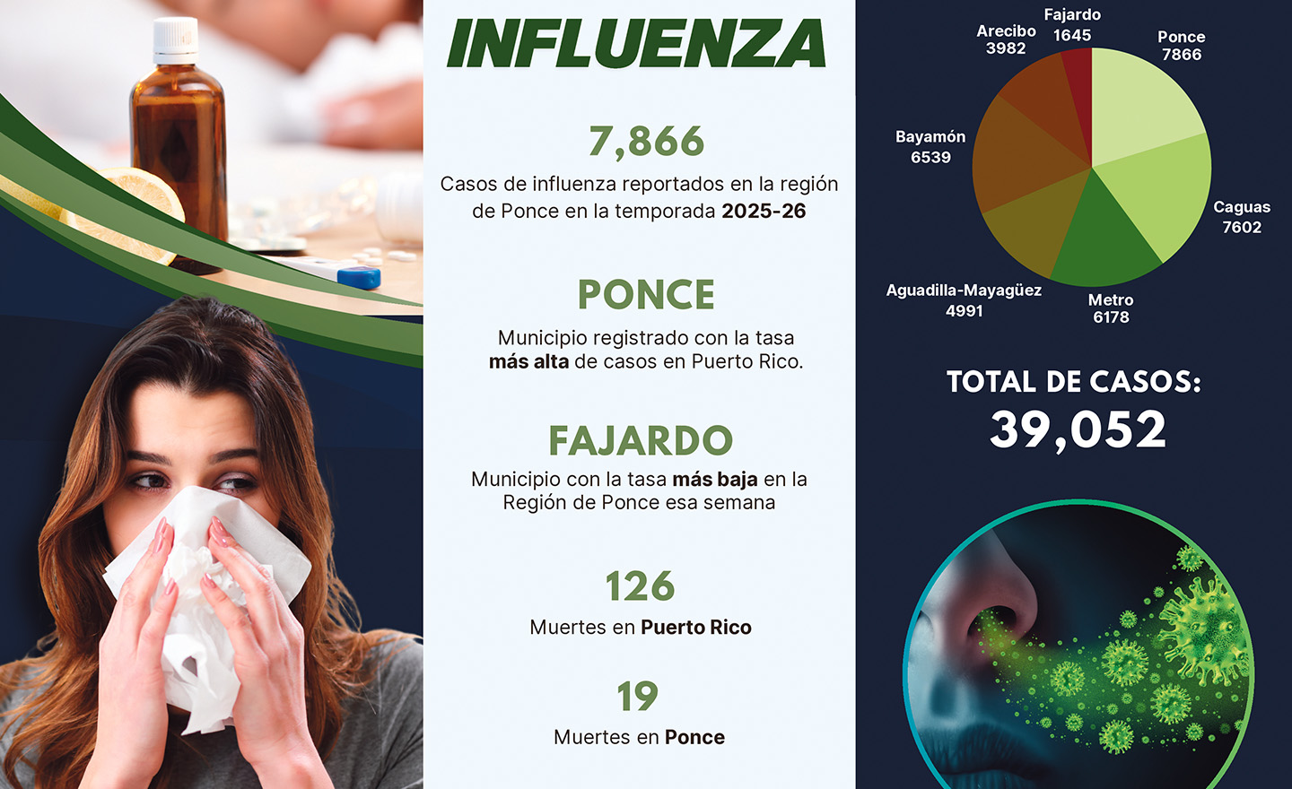 De los 39,052 casos de influenza reportados al 10 de enero, la mayoría (7,866) han sido en la región de Ponce. Esto significa que el 20% o uno de cada cinco han sido en esta zona.