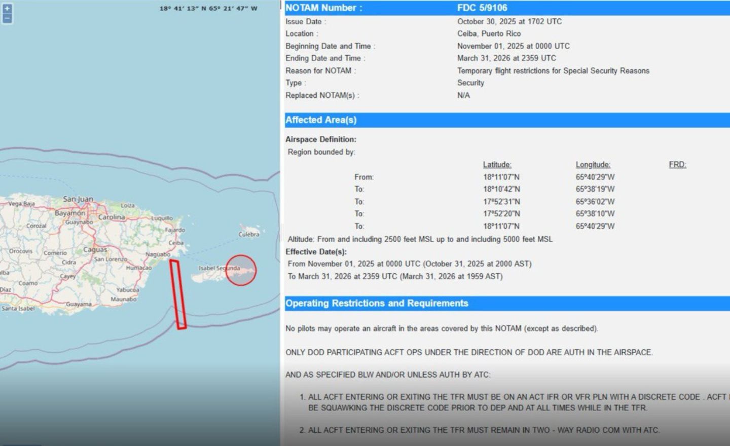 La medida, vigente desde el 1 de noviembre de 2025 hasta el 31 de marzo de 2026, restringe el espacio aéreo comprendido entre 2,500 y 5,000 pies de altura, en un área entre la costa este de Puerto Rico y la isla de Vieques.