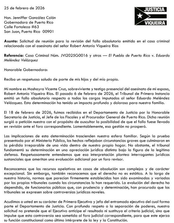 Moshayra Vicente Cruz, viuda del biólogo Robert Antonio Viqueira Ríos, acudió junto a sus hijos, a La Fortaleza para entregar una carta a la gobernadora Jenniffer González Colón, mediante la cual solicita una reunión para dialogar sobre la posibilidad de revisión del fallo absolutorio emitido en el proceso criminal relacionado con el asesinato de su esposo y padre de sus hijos.