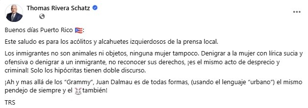 Empero, el galardón de Bad Bunny no recibió el mismo elogio del presidente del Senado, Thomas Rivera Schatz, quien utilizó las redes sociales para hacer público el siguiente mensaje.