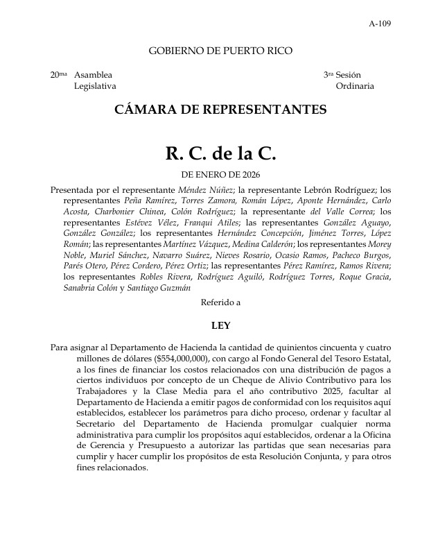 La medida asigna al Departamento de Hacienda $554 millones, con cargo al Fondo General del Tesoro Estatal, «a los fines de financiar los costos relacionados con una distribución de pagos a ciertos individuos por concepto de un Cheque de Alivio Contributivo para los Trabajadores y la Clase Media para el año contributivo 2025.