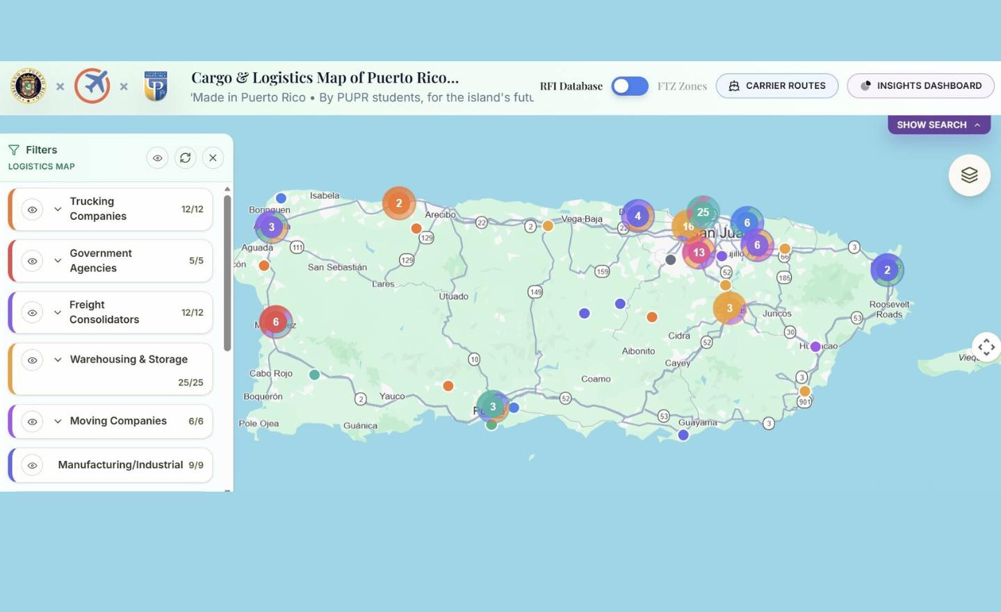 El proyecto fue desarrollado en colaboración con la Universidad Politécnica de Puerto Rico, cuyos estudiantes y facultad trabajaron junto al DDEC en el diseño y construcción de la plataforma. La base de datos inicial se nutrió de más de cien respuestas recibidas a un Request for Information (RFI) dirigido a empresas del sector logístico.