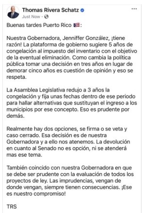 El presidente del Senado, Thomas Rivera Schatz, dijo hoy -martes- que el proyecto aprobado sobre la congelación del impuesto al inventario no será reconsiderado en la Cámara Alta y que la decisión de firmarlo o vetarlo corresponde exclusivamente a la gobernadora Jenniffer González Colón.