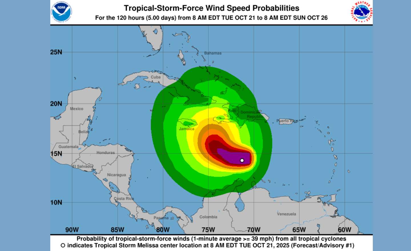 Según el NHC, a las 11:00 de la mañana, el centro de Melissa se ubicaba en la latitud 14.3 grados norte, longitud 71.7 grados oeste, a unas 300 millas al sur de Puerto Príncipe, Haití. Se desplaza hacia el oeste a 14 millas por hora (MPH) con vientos sostenidos de 50 MPH.
