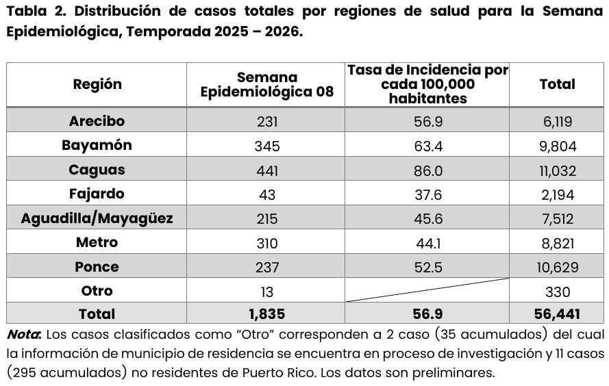 Las regiones de Caguas, Ponce y Bayamón concentran la mayor cantidad de casos reportados con 11,032; 10,629 y 9,804 casos, respectivamente. Casi la mitad de los contagios -48.2%- corresponde a la población pediátrica entre 0 y 19 años.