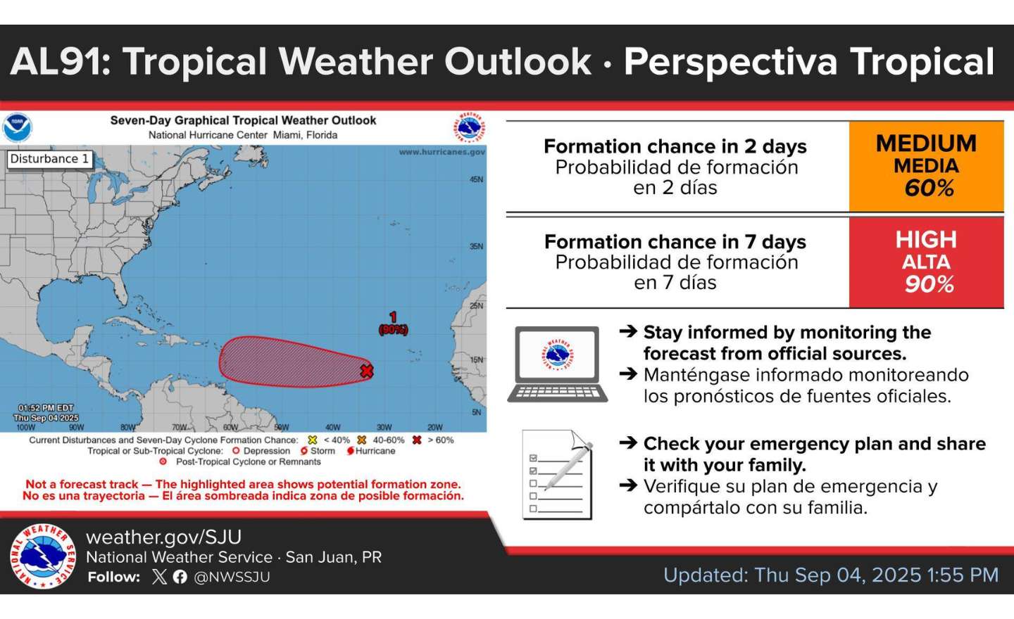El Servicio Nacional de Meteorología informó que se ha formado una amplia área de baja presión a lo largo de una onda tropical sobre el Atlántico tropical oriental.