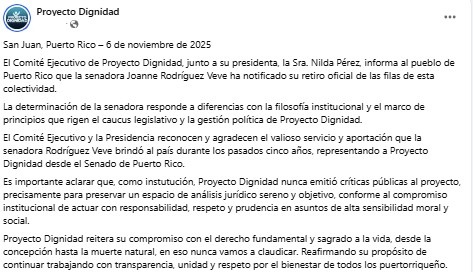 Asimismo, la presidenta de Proyecto Dignidad, Nilda Pérez, dijo en declaraciones escritas que la decisión de Rodríguez Veve “responde a diferencias con la filosofía institucional y el marco de principios que rigen el caucus legislativo”, al reiterar que el partido “nunca claudicará en su defensa del derecho a la vida, desde la concepción hasta la muerte natural”. (De CyberNews)