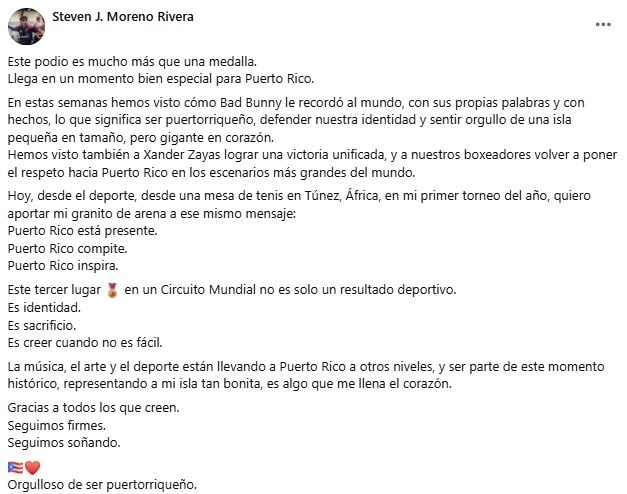 El tenimesista utilizó las redes sociales para agradecer el apoyo que recibe: “La música, el arte y el deporte están llevando a Puerto Rico a otros niveles, y ser parte de este momento histórico, representando a mi isla tan bonita, es algo que me llena el corazón”, escribió.