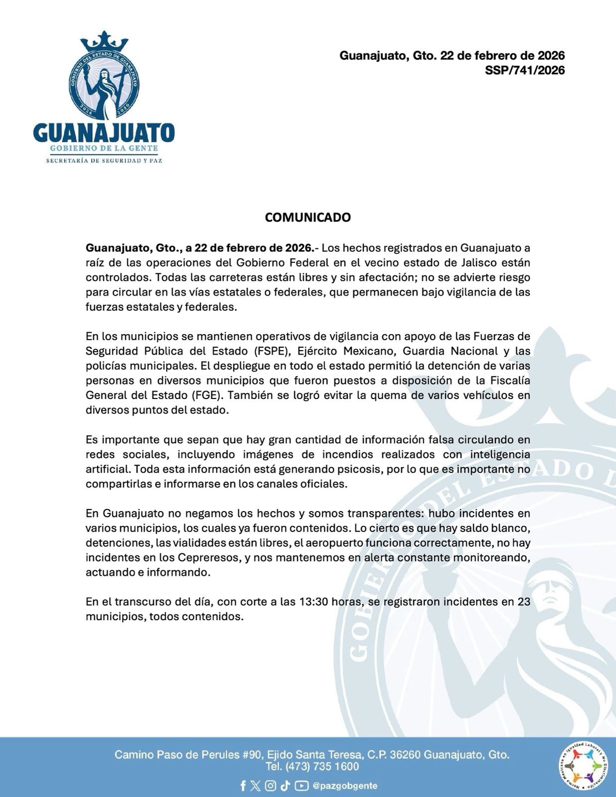 La Secretaria de Seguridad y Paz de Guanajuato informó que los incidentes registrados hoy -domingo- en 23 de los municipios, derivado de las operaciones del Gobierno federal en Jalisco, fueron contenidos y no representan riesgo para la población.
