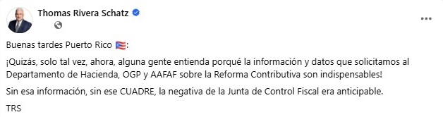 El secretario general del Partido Popular Democrático, Manuel Calderón Cerame, expresó: “La determinación de la Junta de Supervisión fiscal de no dar paso a la reforma contributiva, además de ser otra promesa incumplida, es otro ejemplo de la improvisación y el desorden del gobierno del PNP. El Partido Popular Democrático, así como su liderato legislativo, siempre estarán disponibles para aportar a la discusión contributiva de forma seria y con datos creíbles. Basta ya de mentiras y de politiquería, el pueblo merece que se le reduzca el costo de vida de forma responsable”.