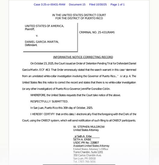 La orden responde a una Informative Notice Correcting Record, presentada ese mismo día por el fiscal federal Muldrow en el caso Estados Unidos versus Daniel García-Martín (Criminal No. 25-431), para corregir el récord judicial y eliminar una referencia errónea contenida en una orden anterior del 23 de octubre, que mencionaba de forma incorrecta una supuesta investigación de cuello blanco.
